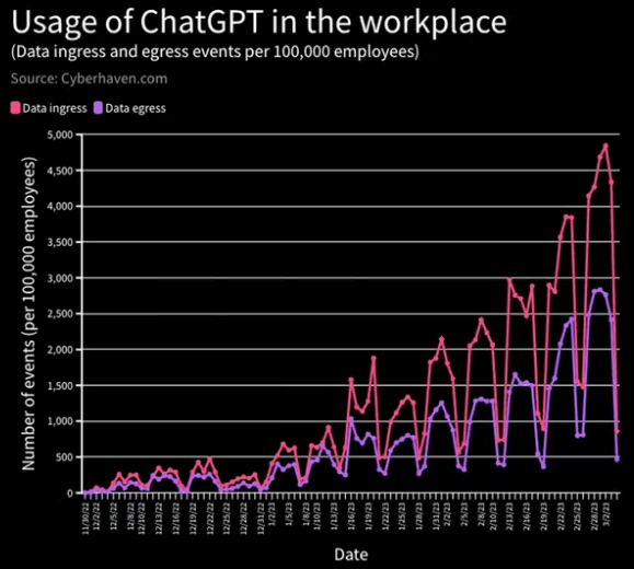3 月 1 日,Cyberhaven 表示,它检测到每 100,000 名员工有 3,381 次将公司数据粘贴到GPT 的尝试,这被定义为“数据出口事件”。