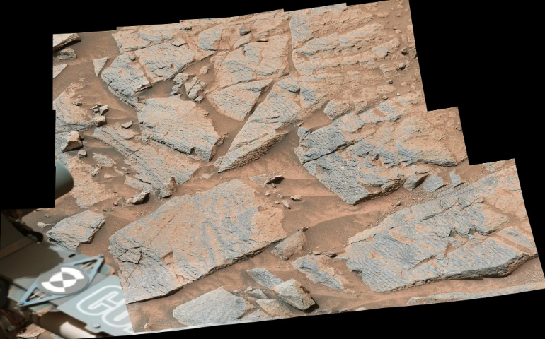 这幅马赛克由好奇号的 Mastcam 在“标记带”区域捕获的 3 张单独图像组成,是由Mastcam的相机拍摄的。