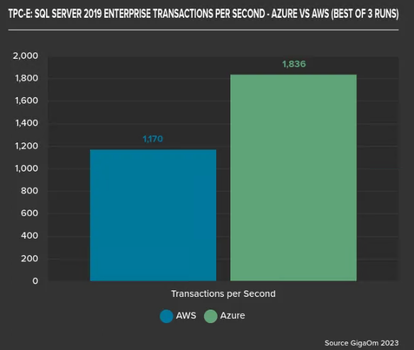 根据GigaOm 基准,Azure 上的 SQL Server 2019 每秒事务处理 (TPS) 比在具有 gp3 卷的 AWS EC2 实例上运行高 57%。如果不包括AWS 许可证移动性和Azure 混合优势,Azure 上的工作负载成本可以降低 34%。
