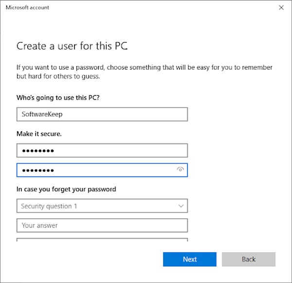 输入用户名,并可选择添加带有安全问题的密码,然后单击“下一步” 。