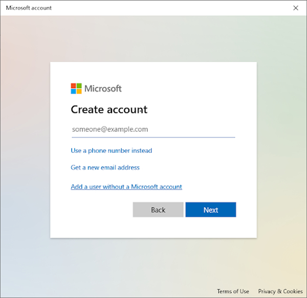 输入您的 Microsoft 帐户详细信息,或创建一个新帐户以登录并完成您的用户帐户设置。