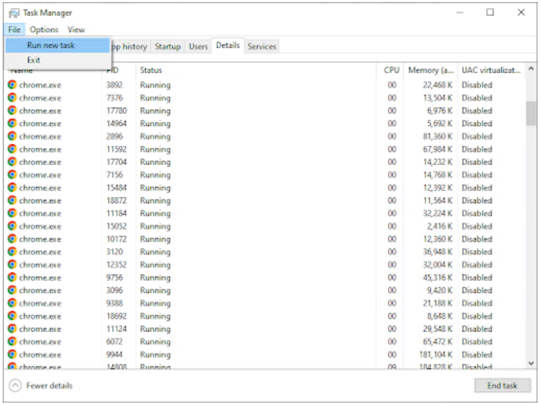 结束该过程后,您可能会注意到系统发生变化,例如任务栏消失。这是正常的。要重新启动 Windows 资源管理器,请单击左上角的文件并选择运行新任务。