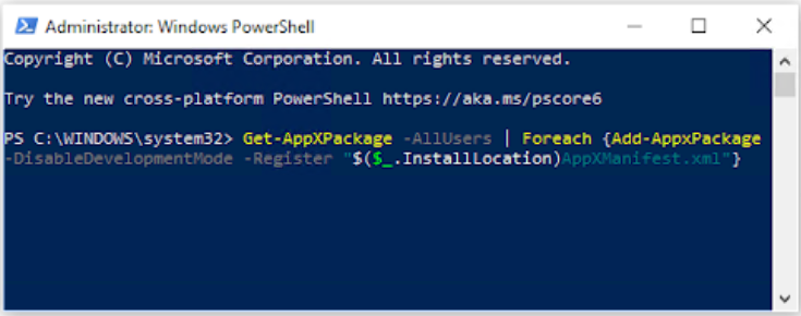 Get-AppXPackage -AllUsers | Foreach {Add-AppxPackage -DisableDevelopmentMode -Register “$($_.InstallLocation)AppXManifest.xml”}