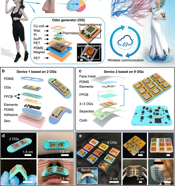 宽度约为 1.5 厘米的嗅觉发生器可以放置在柔性面罩中,以实现最大的无线嗅觉视觉效果