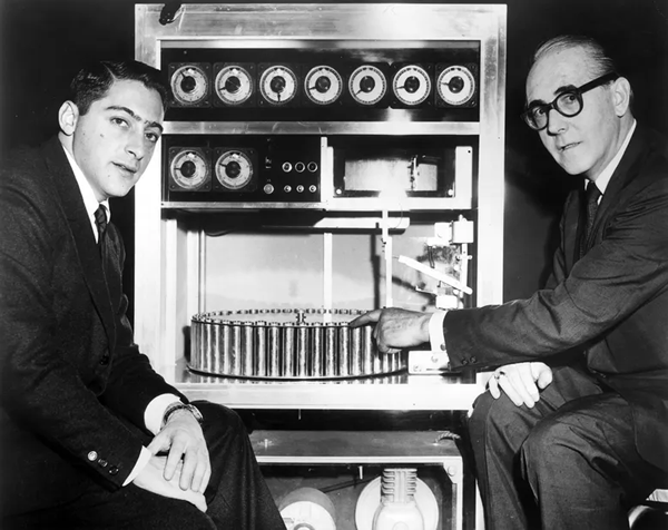 美国电影制片人 Mike Todd Jr. [左] 与瑞士发明家 Hans E. Laube 坐在一起,后者指着他的 Smell-O-Vision 机器,该机器会与电影中的动作同步产生气味。