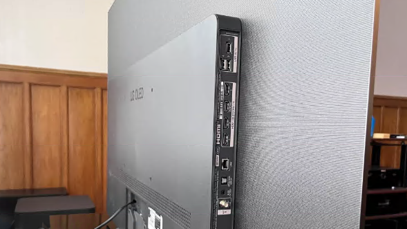 后面板输入包括四个侧面安装的 HDMI 2.1 端口(一个带有 eARC)、一个光学数字输出和一个天线连接。