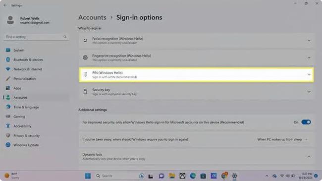 打开 Windows 设置,转到帐户登录选项,然后选择 PIN (Windows Hello)