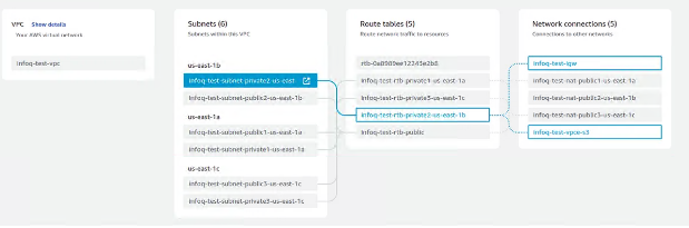 可视化 VPC 中资源的能力使开发人员能够发现常见错误或不良配置,例如,私有子网与 NAT 网关断开连接或直接路由到互联网网关,如下所示: