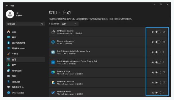 开始设置,选择应用-启动,暂时将所有选项调整为关的状态