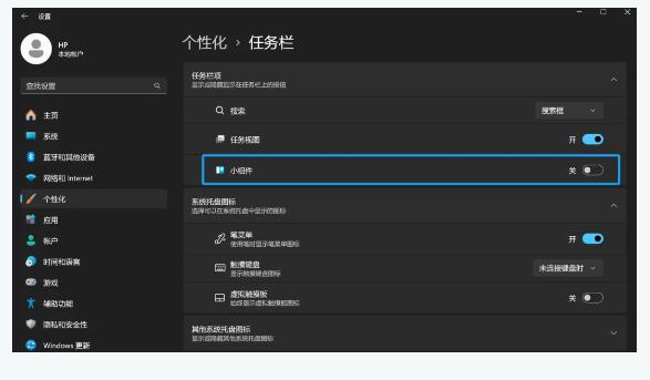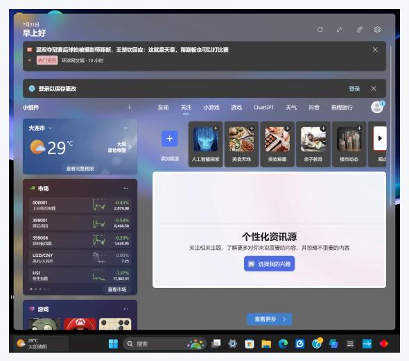 开始菜单,选择设置-个性化-任务栏,关闭【小组件】