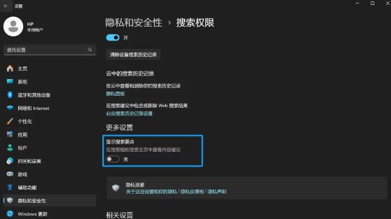 开始菜单,选择设置-隐私和安全性-搜索权限,关闭【显示搜索要点】