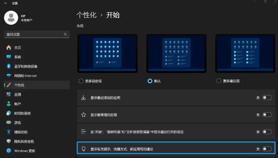开始菜单设置,选择个性化-开始,更改显示布局,关闭【显示有关提示、快捷方式、新应用等的建议】