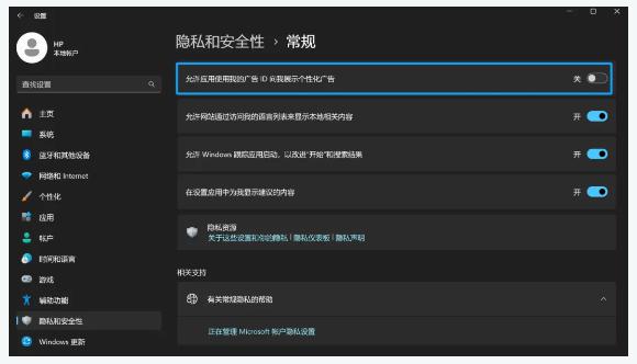 开始菜单选择设置,隐私和安全性-常规,关闭【允许应用使用我的广告ID 向我展示个性化广告】