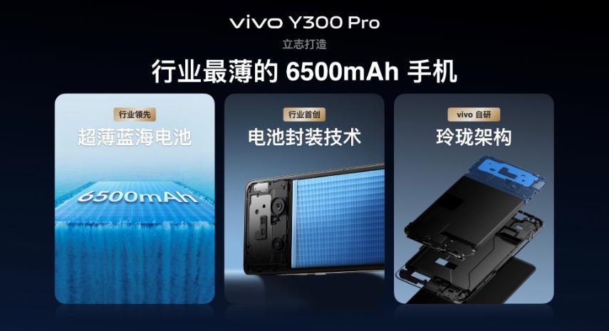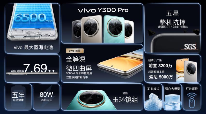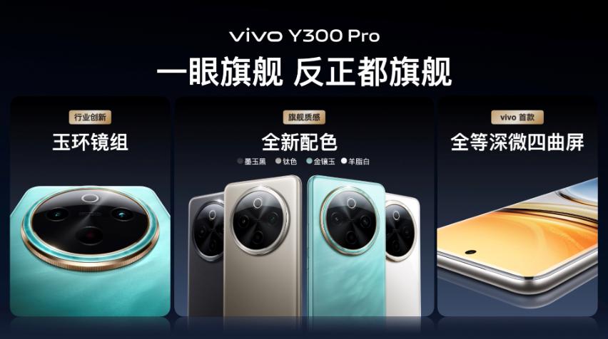 vivo Y300 Pro搭载6500mAh超薄蓝海电池、80W远航闪充,带来旗舰级闪充续航组合;同档首发全等深微四曲屏、旗舰同款的镜组设计—玉环镜组、旗舰主流配色—钛色,打造一眼旗舰的外观设计;搭配前置3200万超清小广角、后置索尼5000万超清镜头,实现同档领先的影像表现。vivo Y300 Pro以从内到外的全面升级,真正打造一款让用户愉悦的“国民手机”。