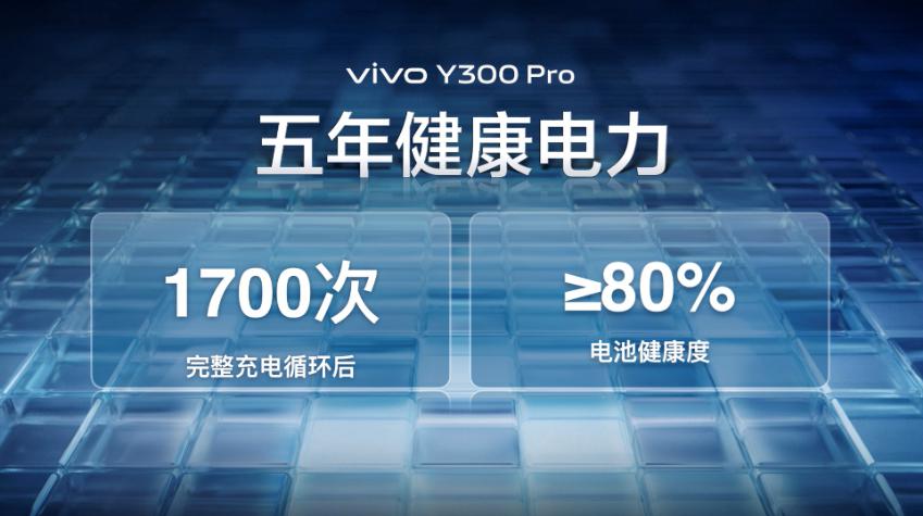 vivo Y300 Pro以旗舰级安全品控作为标准,创新电池材料,将电池寿命提升至行业标准超2倍,1700次充放电循环剩余容量≥80%。同时,借助自研电池健康算法及智慧充电引擎,智能识别用户充电场景,提供夜间久充、高温充电保护,并根据电池老化程度匹配电压和电流,降低损耗,带来5年耐用的超长寿蓝海电池。