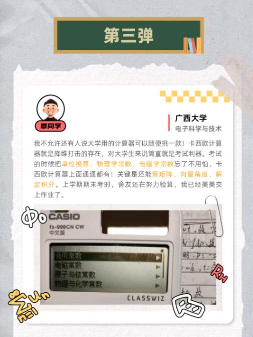 我不允许还有人说大学用的计算器可以随便挑一款!卡西欧计算器就是降维打击的存在,对大学生来说简直就是考试利器。考试的时候把单位换算、物理学常数、电磁学常数忘了不用怕,卡西欧计算器上面通通都有!关键是还能算矩阵、向量角度、解定积分。上学期期末考时,舍友还在努力验算,我已经美美交上作业了。