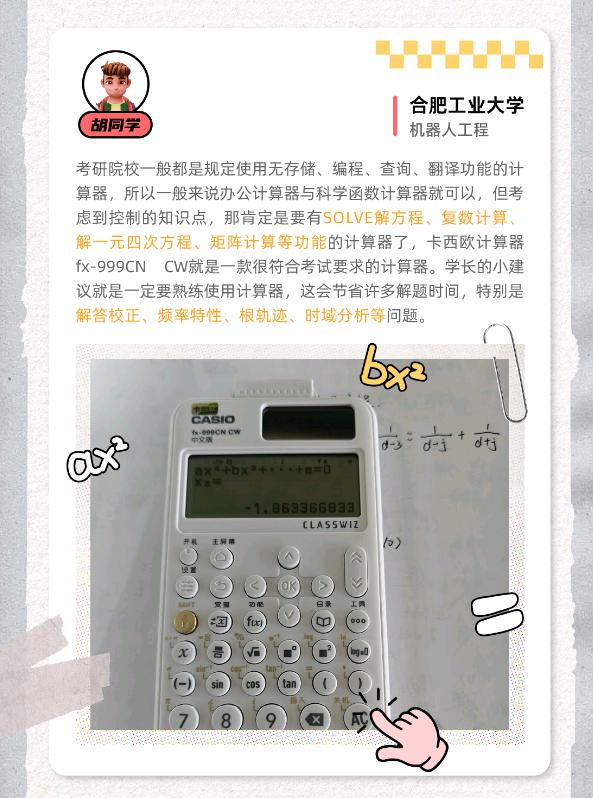 考研院校一般都是规定使用无存储、编程、查询、翻译功能的计算器,所以一般来说办公计算器与科学函数计算器就可以,但考虑到控制的知识点,那肯定是要有SOLVE解方程、复数计算解一元四次方程、矩阵计算等功能的计算器了,卡西欧计算器fx-999CNCW就是一款很符合考试要求的计算器。学长的小建议就是一定要熟练使用计算器,这会节省许多解题时间,特别是解答校正、频率特性、根轨迹、时域分析等问题。