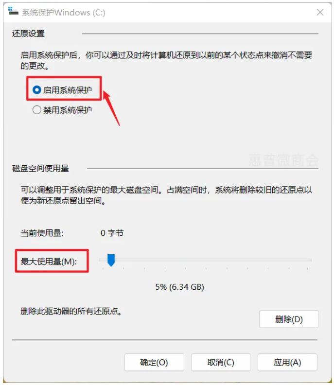 3、 选择【启用系统保护】,同时可调整下还原点对空间的最大使用量,设置完成后点击确定;