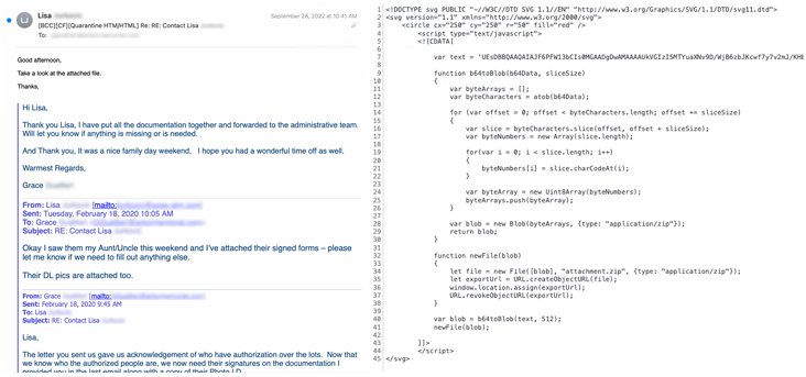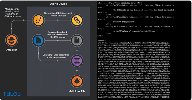 Cisco Talos 发现了这种新的分发方法,该公司表示,它发现了带有 HTML 附件的欺诈性电子邮件,其中包含包含HTML 脚本标签的编码 SVG 图像。
