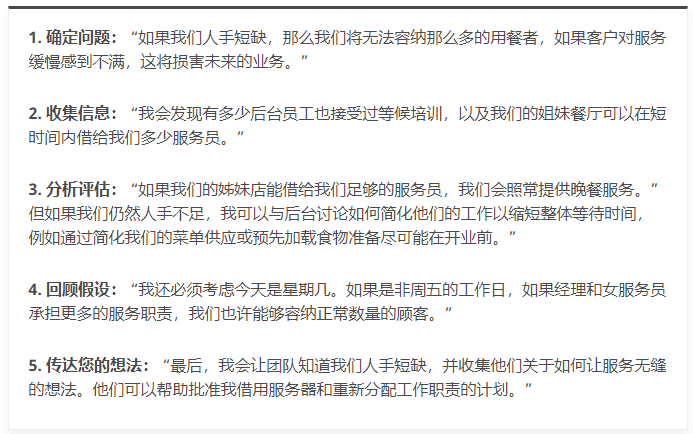 这是一个餐厅经理候选人如何在回答以下问题时表现出卓越的批判性思维能力的示例:“如果多名前台员工请病假,您将如何确保餐厅的一切顺利进行?”