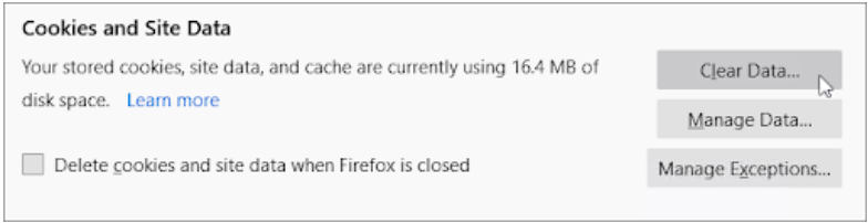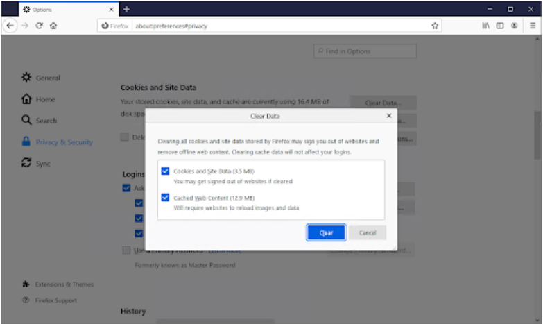 选择Cookies and Site Data和Cached Web Content ,然后点击Clear按钮继续。等待 Firefox 处理您的请求并删除数据。