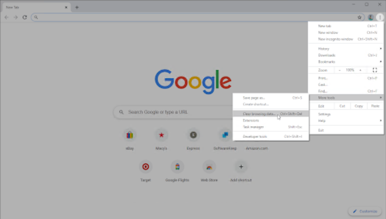 单击更多图标(垂直放置在您的 Chrome 用户图标旁边的三个点),然后将鼠标悬停在更多工具上。从下拉菜单中选择清除浏览数据。
