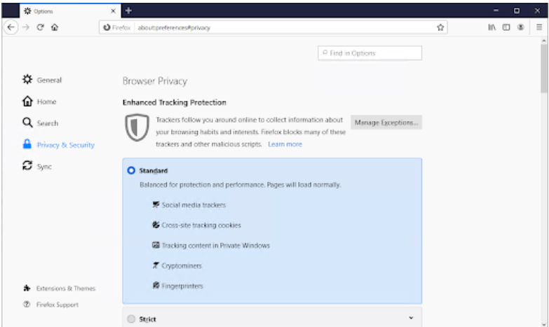 在地址栏中输入about:preferences#privacy ,然后按键盘上的 Enter 键。您将被重定向到 Firefox 的设置页面。