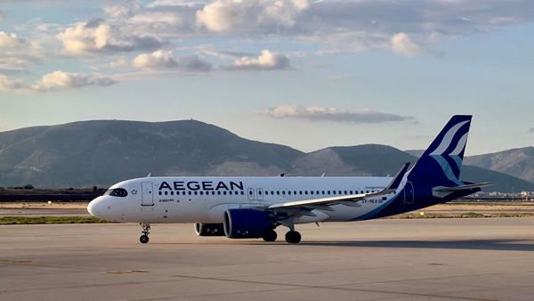 一架爱琴海航空公司的空客 A320 停泊在雅典国际机场的停机坪上