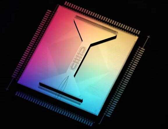 Quantinuum 的 H2 量子计算机芯片具有 32 个量子位,由电磁陷阱内的单个镱离子组成。
