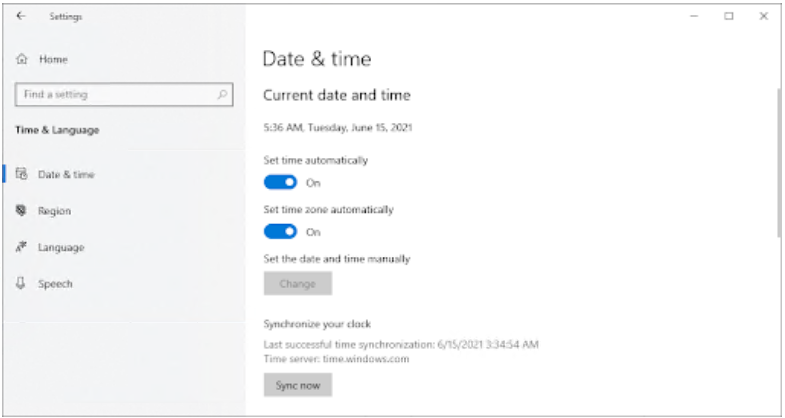 将自动设置时间和自动选择时区选项切换为开。Windows 会将您的日期和时间与您所在时区的当前时间同步。