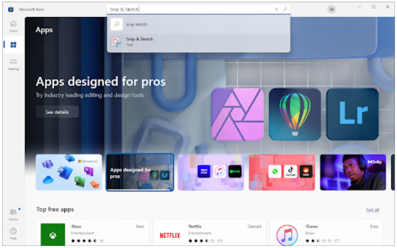 在开始之前,请确保您的计算机上安装了最新版本的 Snip and Sketch。您可以通过打开 Microsoft Store 并检查更新来执行此操作。