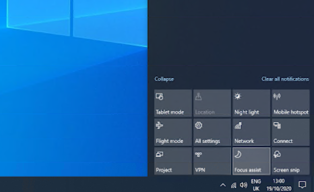 要关闭安静时间(也称为焦点辅助或请勿打扰),请单击任务栏右下角附近的操作中心图标。或者,按Windows + A快捷键。