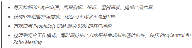 在此示例中,候选人强调了他们的客户服务硬技能(销售人员自动化软件、Oracle PeopleSoft、CompTIA Network+ 认证)以及相关的软技能(沟通、适应能力、分析技能)。这份简历摘要让雇主知道候选人有资格担任高级客户服务职位。