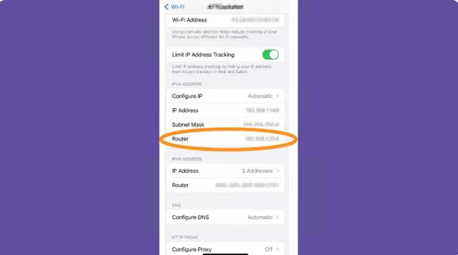 此屏幕截图显示了 iPhone 上设置应用程序中路由器的 IP 地址。