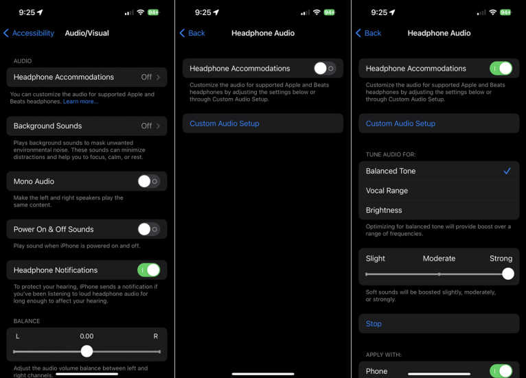 您可能想尝试播放音乐、播客、有声读物或自己资料库中的其他音频,以发现哪些设置最适合您自己的口味。或者,如果您点击自定义音频设置并回答几个问题,则可以自定义音频输出。您的音频设置将根据您的答案而变化。