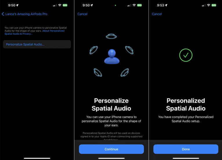 前往“设置”>蓝牙> [您的 AirPods 信息图标],然后轻点“个性化空间音频”。点击个性化空间音频的设置。轻点“继续”,取下 AirPods(如果您的耳朵里有它们),然后让手机扫描您的脸部。现在启动支持的音频或视频以收听空间音频的运行情况。