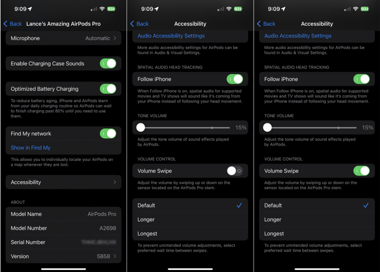 第二代AirPods Pro通过更好的音频质量和其他功能增强了耳塞。一个新选项允许您通过在位于 AirPods 杆上的传感器上下滑动来调节音量。要启用此功能,请前往“设置”>蓝牙> [您的 AirPods 信息图标] >“辅助功能”。打开音量滑动开关。您还可以通过选择“更长”或“最长”来调整轻扫之间的时间以避免意外更改音量。