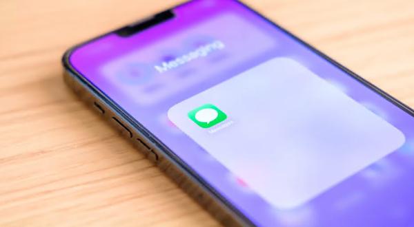 带有紫色壁纸的 iPhone 13 Pro Max 的图像。屏幕上是 iOS 消息应用程序,在主屏幕文件夹中打开