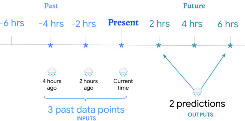 请注意,我们选择进行 2 次预测,一次在未来 2 小时和 6 小时。但是你可以根据需要制作多少。而在需要的输入量方面,过去的数据越多越好,但我们发现至少需要 3 个输入点才能给出足够的上下文来对未来做出任何预测。