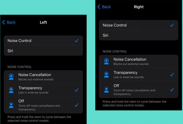 AirPods 的另一个不错的功能是您可以在每个单独的 Pod 中关闭 ANC 和透明模式,如果您需要仍然能够听到周围发生的事情,则可以为您提供灵活性。您可以通过访问您的 AirPods设置并在按住 AirPods下控制每个 Pod 来执行此操作。