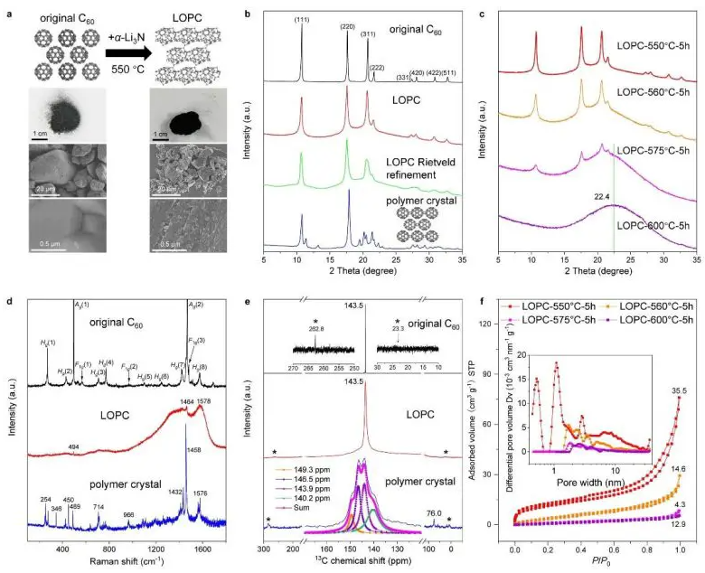 a) 原子结构模型、光学和 SEM 图像。b) Cu Kα (λ = 0.15418 nm) X射线衍射图谱与模拟LOPC基于提出的原子结构模型。AU,任意单位。c) LOPC的X射线衍射图,温度由LOPC-550等表示。用于在不同温度下制备的样品。d) 原始 C60、LOPC 和聚合物晶体的拉曼光谱。e) 13C MAS-SSNMR 波谱。粉色线表示聚合物晶体的洛伦兹峰拟合;*表示自旋边带。f) LOPC 的低压 Ar (87.3 K) 吸附/解吸等温线和(插图)孔径分布(通过使用具有 DFT 平衡模型的狭缝孔计算),每条等温线曲线上方标记了比表面积值 (m2 g?1)。学分:基础科学研究所