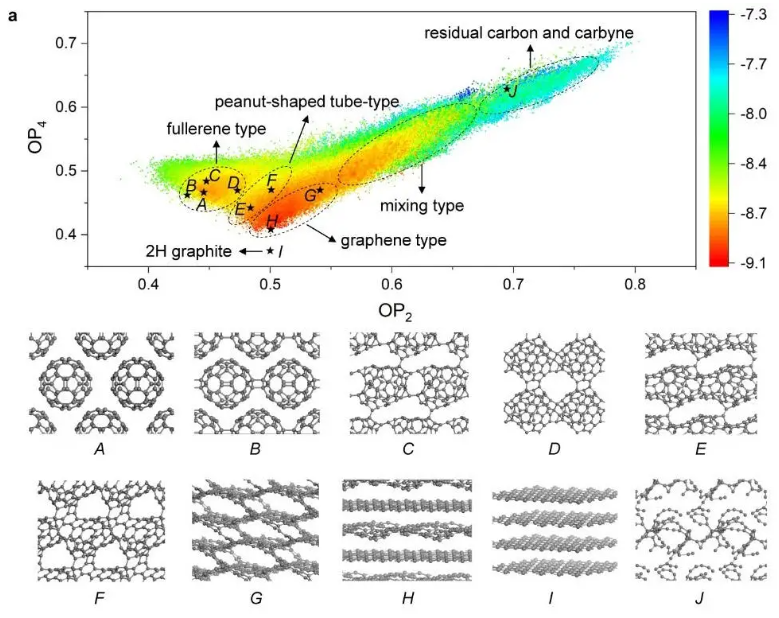 这种新碳通过多种方法表征,并且(事实上)它的表征并不容易,因为各种略有不同的“破碎的C60笼”,但它们仍然保持它们在标准面心立方晶格中的位置。利用X射线衍射、拉曼光谱、魔角自旋固态核磁共振波谱、像差校正透射电子显微镜和中子散射等手段,对这种新型碳的结构有了深入的了解。基于神经网络类型建模的数值模拟,结合上述实验方法,表明LOPC是从“富勒烯型”到“石墨烯型”碳转变过程中产生的亚稳结构。
