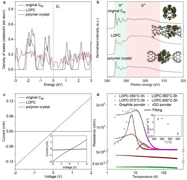 “碳K边缘近边缘X射线吸收精细结构”数据显示,LOPC中的电子离域程度高于C60。在室温下,电导率为1.17×10?2 S cm?1,并且在低于30开尔文的温度下传导似乎是短距离金属传输的组合,由载流子跳跃打断。了解这些电学特性对于阐明这种新型碳的可能应用非常重要。