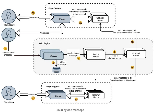 每个 Slack 客户端都有一个到 Slack 服务器的持久 WebSocket 连接,以接收实时事件以维护其状态。客户端通过几个步骤建立 WebSocket 连接,例如从 Webapp 后端获取用户令牌和 WebSocket 连接设置信息。然后客户端向最近的边缘区域发起 WebSocket 连接,GS 获取用户信息并向客户端发送第一条消息。Envoy负载平衡传入流量并处理 TLS 终止。