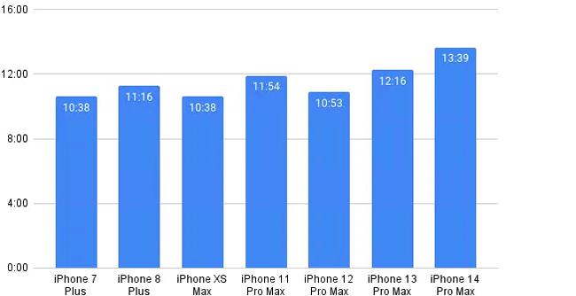 虽然存在一些异常情况,但总的来说,苹果在每个新版本中都提高了电池续航时间。对于 iPhone 15 Pro 和 15 Pro Max,所有这些预期的升级都可能会改变游戏规则。如果我们只关注最大尺寸的 iPhone Plus 和 Pro Max 型号,您可以看到 iPhone 7 Plus 的续航时间为 10 小时 38 分钟,一直到 iPhone 14 Pro Max 的续航时间- 领先时间为13小时39分钟。