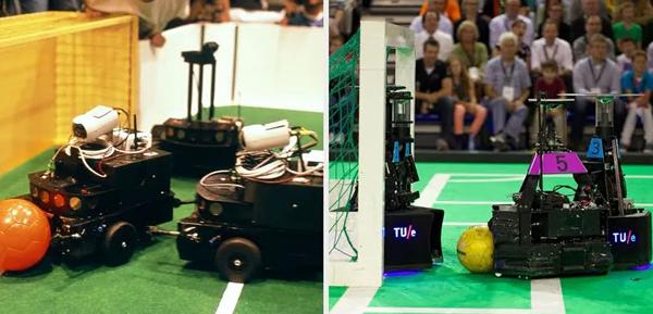 自 2011 年起,RoboCup 联合会的理事们就有了在 RoboCup 赛事结束时与中型联赛获胜队进行一场友谊赛的传统。近年来,中型机器人的竞争力变得令人惊讶,能够保持控球权,运球绕过对方球队,并在球场上串联传球。这些机器人可能还没有准备好与世界冠军较量,但进展已经令人印象深刻——2022 年,Tech United Eindhoven与葡萄牙职业女子球队Vitória SC进行了一场友谊赛,机器人成功打进了几个进球(在女人们对她们放松之后)。