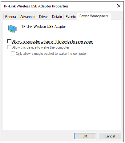 确保取消选中允许计算机关闭此设备以节省电源选项,然后单击确定。