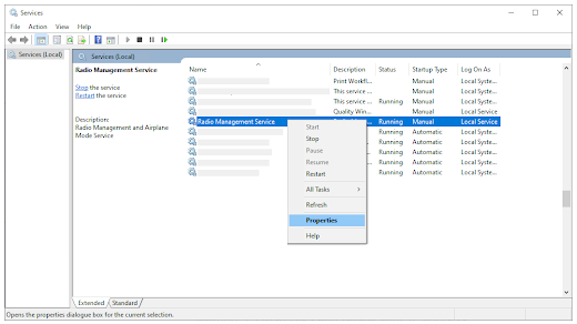 向下滚动,直到找到Radio Management Service 。找到它后,右键单击它并选择Properties 。