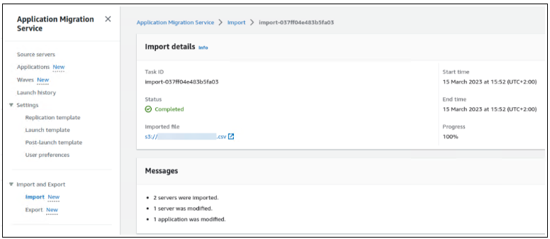 导入和导出– 您现在可以使用应用程序迁移服务将源环境清单列表从 CSV 文件导入到服务中。您还可以导出源服务器清单以用于报告目的、离线审查和更新、与其他工具和 AWS 服务的集成,以及通过重新导入清单列表来执行批量配置更改。