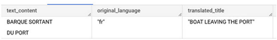 注意:包含要翻译的文本的表列必须命名为 text_content:结果表将包含可以解析以提取原始语言和翻译文本的 json。在这种情况下,模型检测到标题文本是法语并将其翻译成英语: